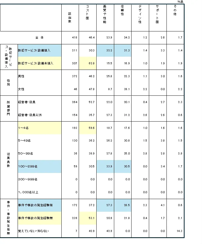 また、企業規模別に見ると、小規模事業者ほど「価格」を重視する傾向が強く、従業員100名以上の企業では、防犯カメラを経営リスク対策の一環と捉え、「信頼性」や「性能」を重視する割合が高くなっていることがわかりました。さらに、過去に事件・事故を経験した層では、「証拠として使えるか」「確実に守れるか」という視点が強まり、防犯意識が大きく変化していることが分かりました。