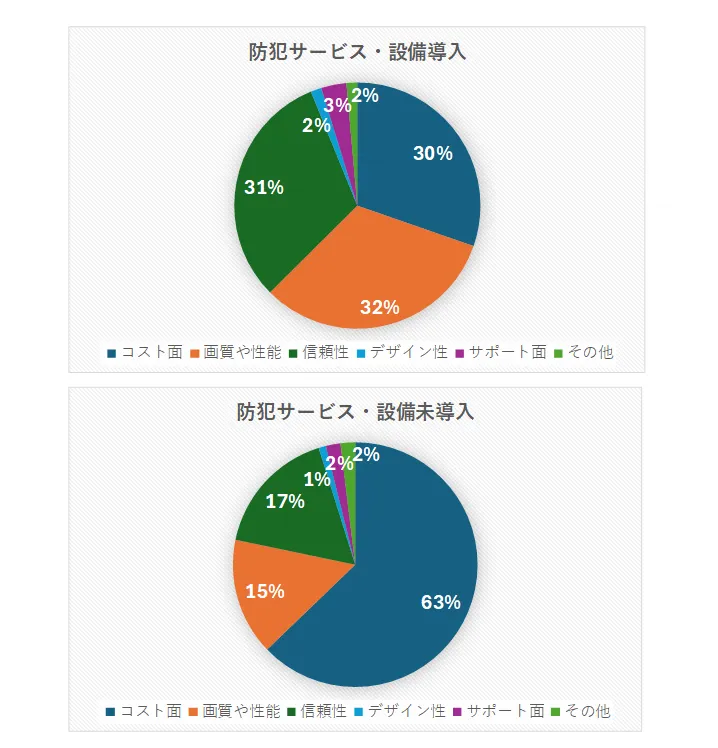 本調査では、防犯カメラに対する価値認識が、立場や経験によって大きく異なることが明らかになりました。防犯サービス・設備を未導入と回答した層では、約6割が「コスト面」を最も重視しており、初期費用への不安が導入の障壁となっていることがわかりました。