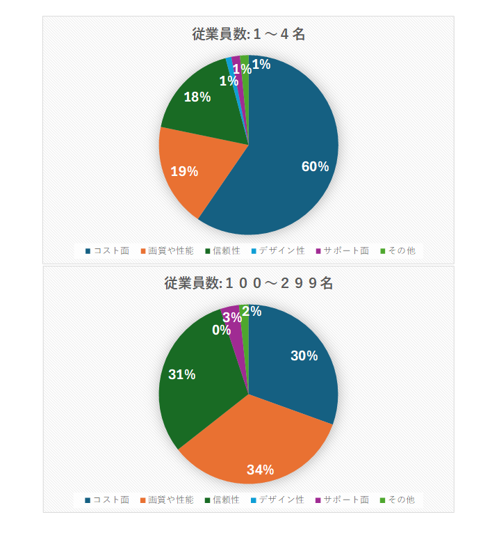 一方、すでに導入している層では、「画質・性能」や「信頼性」が、「コスト」と同等、またはそれ以上に重視されていました。実際に運用することで、価格よりも「本当に使えるか」という実用性が、判断基準へと変化していると考えられます。