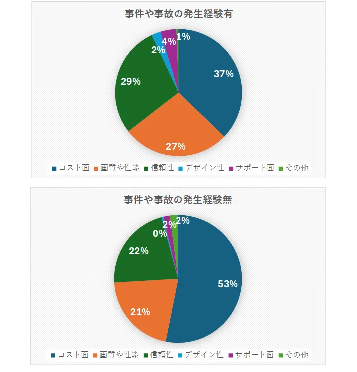 事件・事故の経験が、防犯意識を大きく変える!過去に事件・事故を経験した層では、「コスト」一辺倒ではなく、「画質・性能」「信頼性」を重視する回答が増加しました。被害を経験したからこそ、「証拠として使えるか」「確実に守れるか」という視点の強まりが、数字として表れています。この結果は、「被害に遭ってからでは遅い」という防犯の本質を、社会に問いかけるものと言えます。